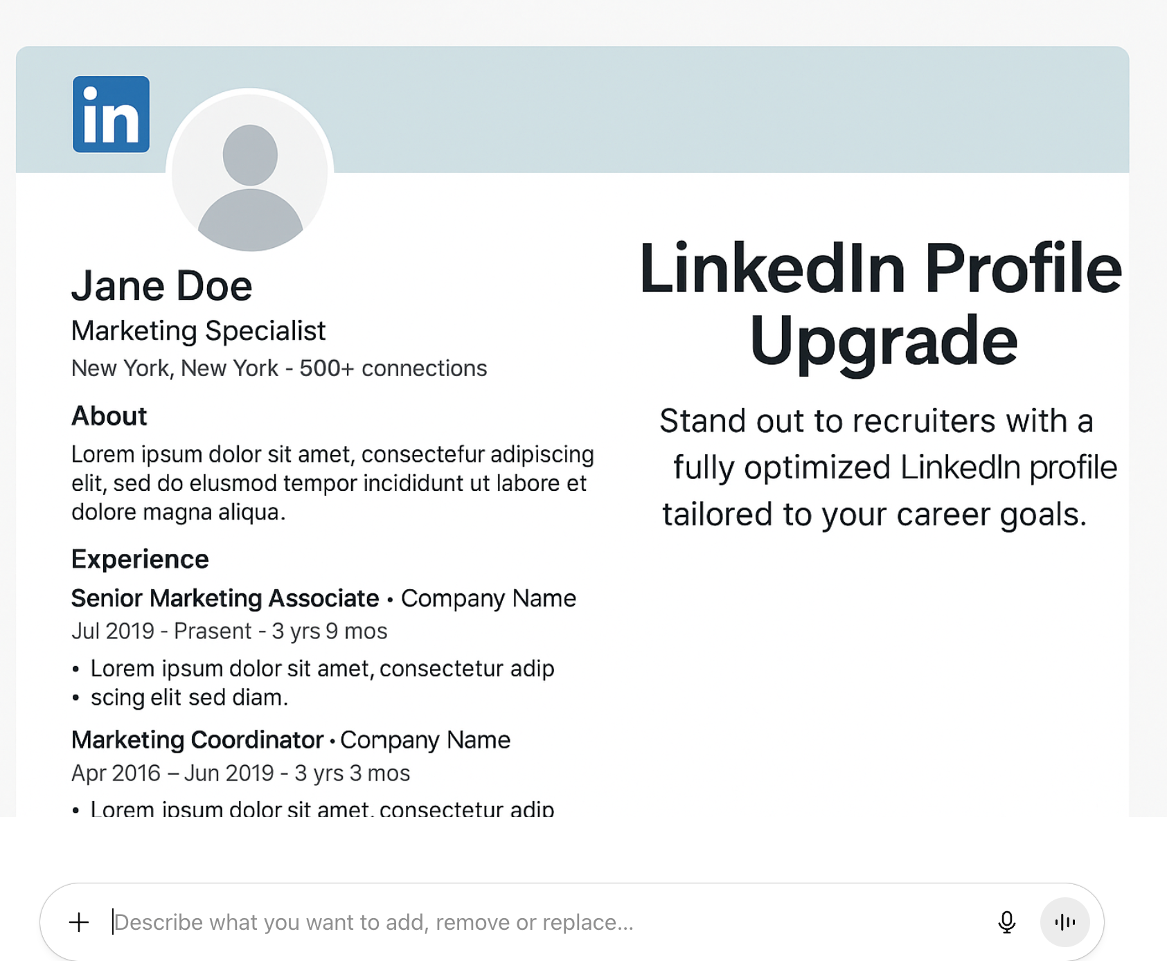 Stand out to recruiters with a fully optimized LinkedIn profile tailored to your career goals. We’ll create a professional headline, about section, experience bullets, skills list, and more designed to get you noticed and increase your chances of landing interviews.